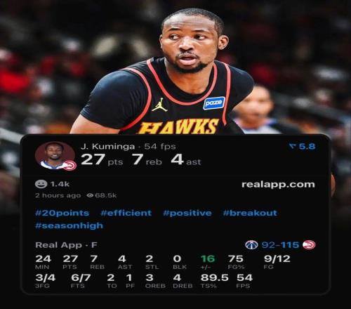 迎來老鷹生涯首秀的庫明加表現(xiàn)十分搶眼,替補(bǔ)出戰(zhàn)約24分鐘,投籃12中9,其中三分4中3,罰球7中6無比高效砍下27分外加7板4助2斷全面數(shù)據(jù),正負(fù)值+16,幫助新東家119-98輕松擊敗奇才。