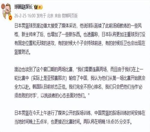 北京時間2月26日18:05,中日男籃將在世界杯預(yù)選賽窗口期迎來直接對話。賽前,日本隊核心球員渡邊雄太在接受媒體采訪時,釋放出強烈戰(zhàn)意——“我們不關(guān)心排名,只把中國和韓國當作必須擊敗的對手?!?/p>